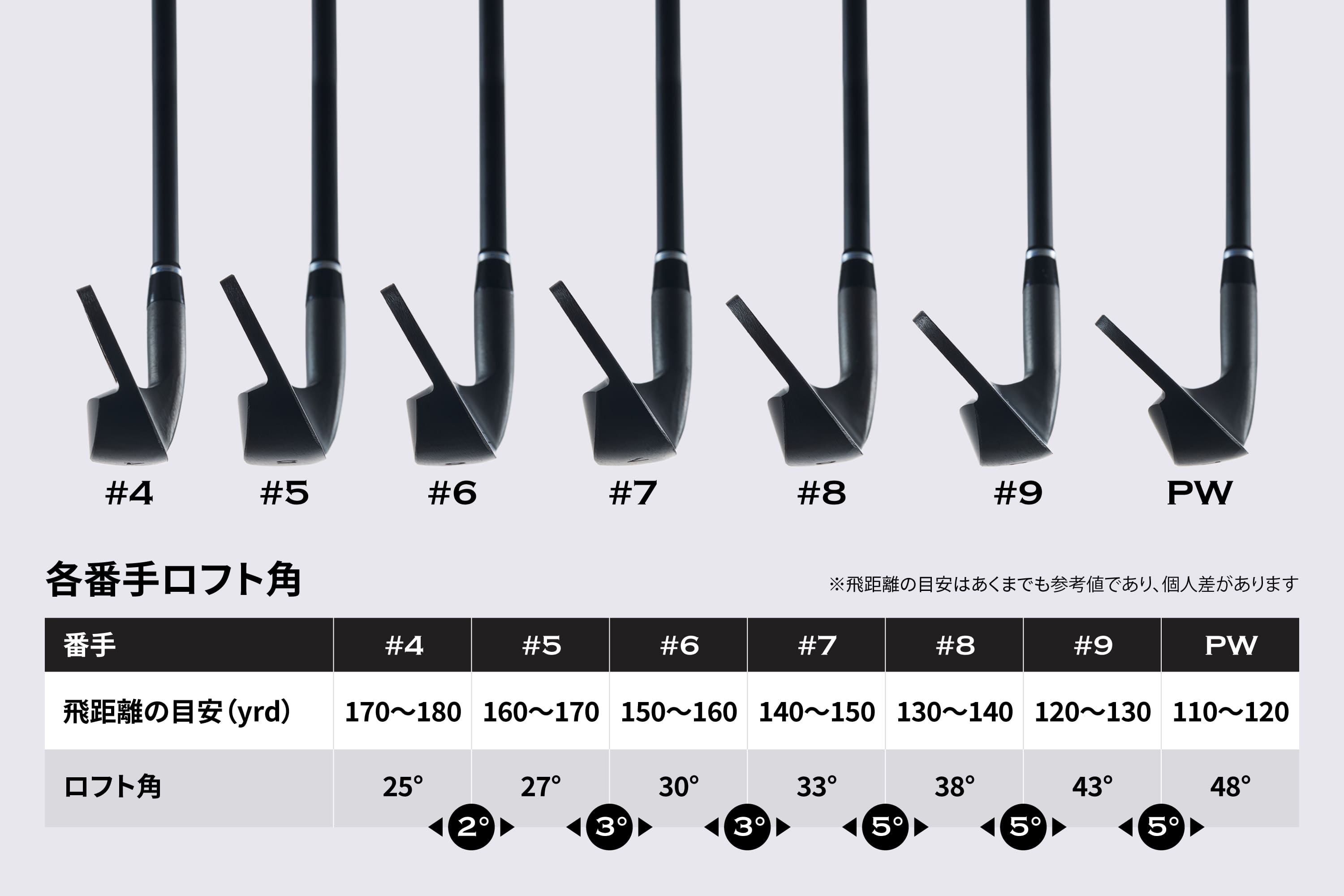 ワンレングスアイアンにおいて同じ長さ・重さで飛距離の違いを生み出すのは、ロフト角の違いです。長さと重さは同じでもヘッドの角度がそれぞれ異なるため、角度の差で飛距離に違いが出せるようになっています。